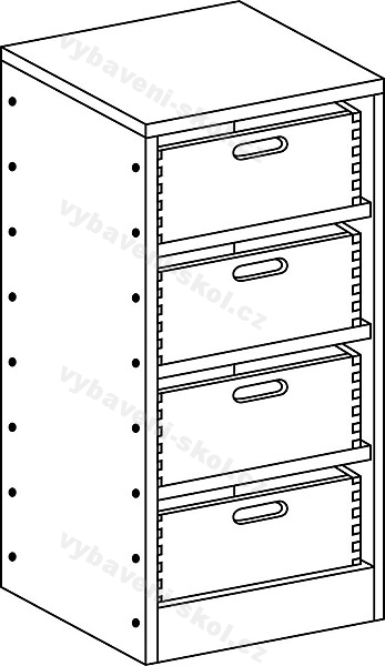 Skříňka se soklem, se třemi policemi a čtyřmi volnými zásuvkami. Rozměr: 40x82,6x40 cm (Š x V x H).