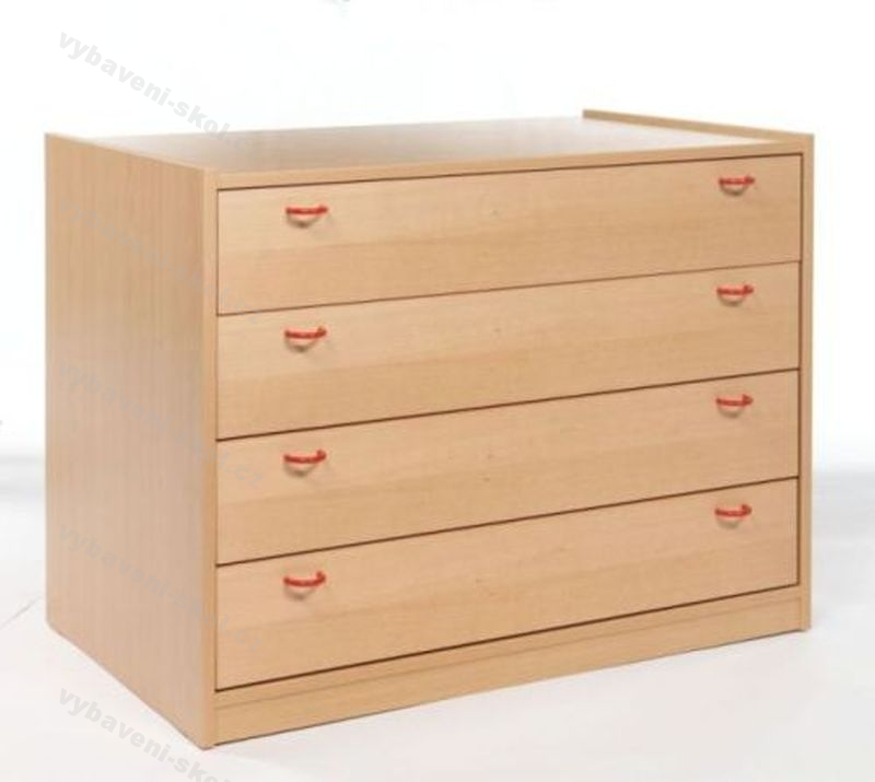 Nízká skříňka uzpůsobená potřebám těch nejmenších dětí. Korpusy jsou laminové (18 mm) v dezénu buk, bříza, javor a bílá chráněné 2 mm ABS hranou. Čela zásuvek jsou dýhovaná, povrch je ošetřen úpravou polomatným polyuretanovým lakem a nabízíme variantu čela zásuvek z laminované dřevotřísky o síle 18 mm s 2 mm ABS hranou s výběrem barevného provedení. K výběru jsou tři typy úchytek.