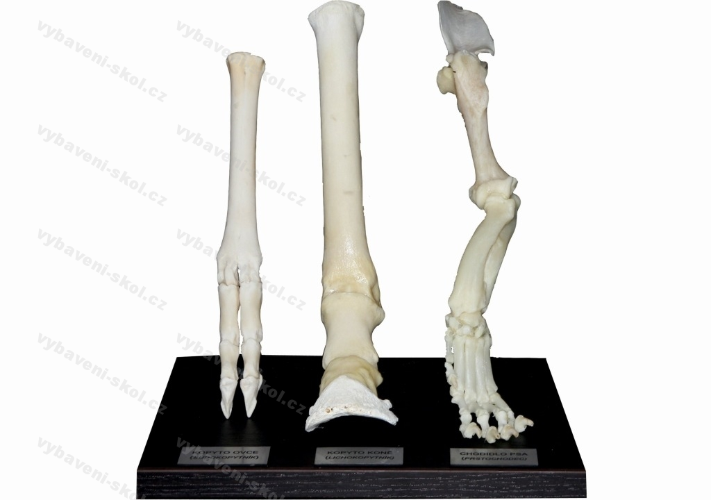 Sada 3 reálných kostěných preparátů z pravých kostí zvířat. Sudokopytník (noha ovce), lichokopytník (noha koně), prstochodec (končentina králíka). Umístěno na dřevěném podstavci. Jednotlivé díly lze snímat z podstavce. Popisky s českými a latinskými názvy. Špičková kvalita zpracování profesionálními českými preparátory.