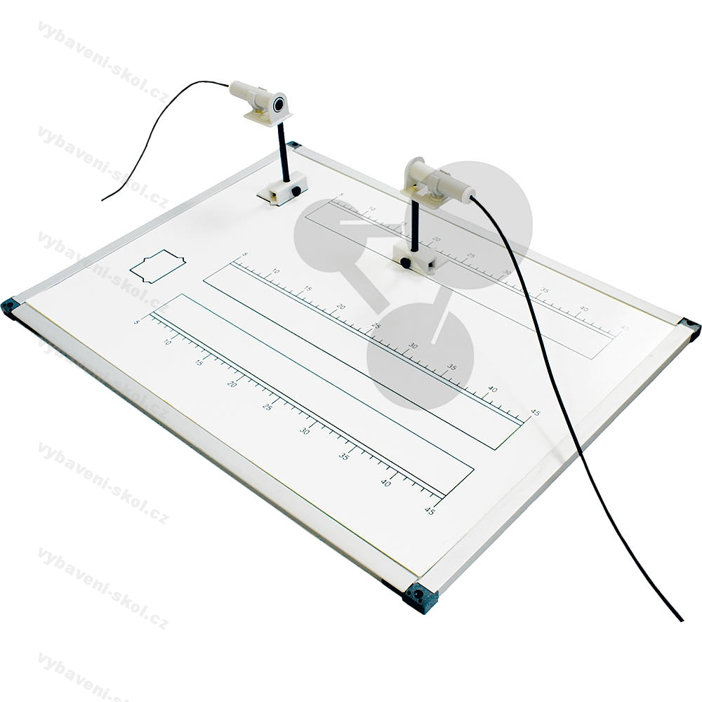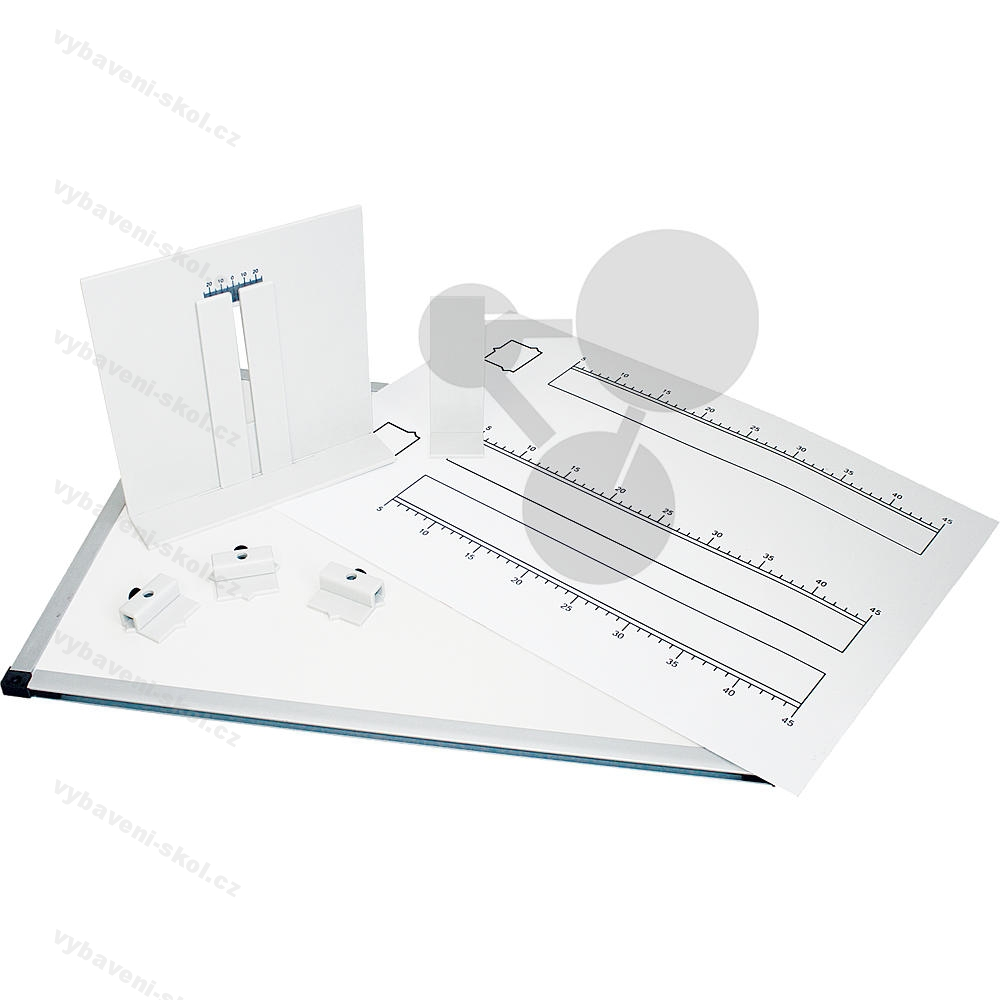 Sestava obsahuje bílou magnetickou tabuli. Na oboustranně potištěné odolné plastové fólii je natištěno dělení stupnice a měřítka pro provádění pokusů na odraz, interferenci a ohyb a stanovení vlnové délky. Výsledky lze velice jednoduše odečíst a později vyhodnotit. Tabuli i fólii je možné popisovat popisovači Whiteboard nebo vodorozpustnými popisovači Overhead. Jedna strana znázorňuje sestavu pro pokusy na odraz, druhá strana všechny sestavy na téma měření vlnové délky, ohybu a interference. Součástí dodávky jsou tři nožky na uchycení držáku pro vysílač a přijímač, rovněž jako nastavitelná štěrbinu na pokusy na ohybu a stínítko pro pokusy na odrazu. Všechny sestavy (kromě fólie z plastu) lze magneticky upevnit.