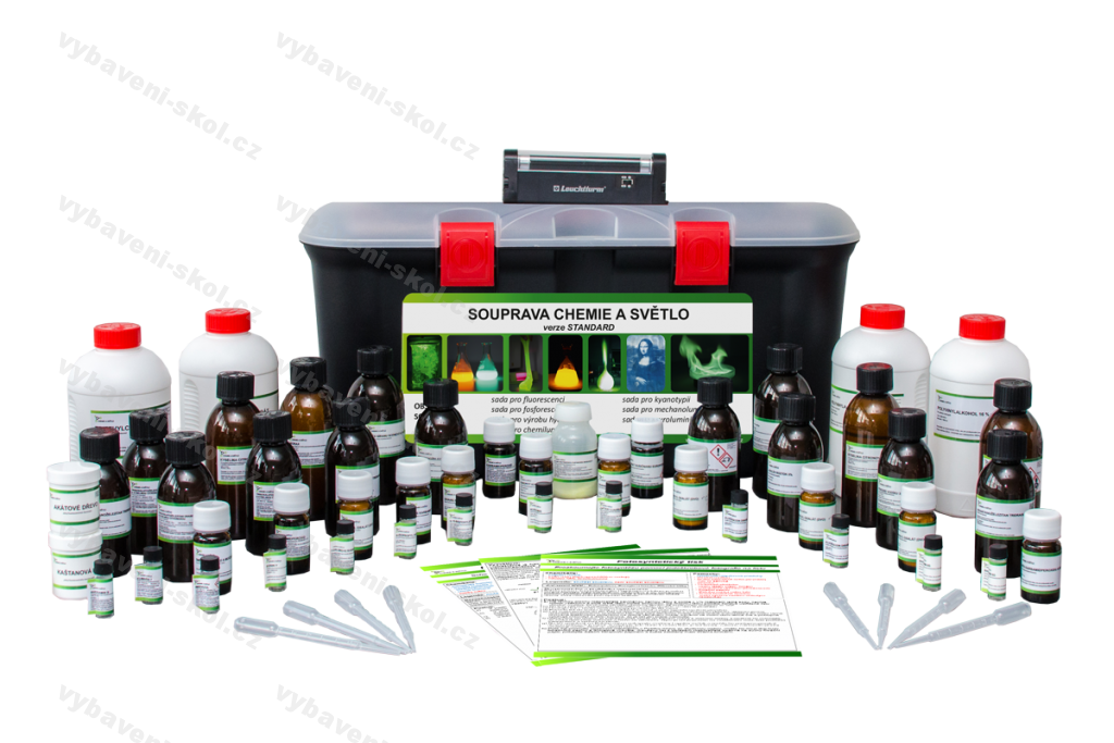 V soupravě Standard naleznete celou řadu atraktivních experimentů, které souvisejí s chemií a světlem. Ke každému tématu dodáváme jednotlivé žákovské návodové karty, učitelské metodické poznámky a učitelský teoretický manuál s detailním vysvětlením.