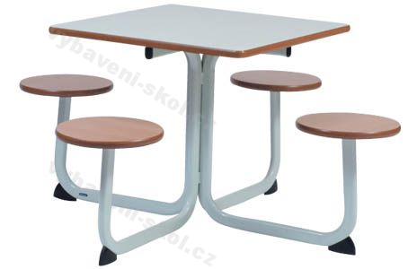 Velmi efektivní, moderní vybavení pro jídelny v mateřské školce, základní škole, dětských centrech, restauračních a dalších stravovacích zařízeních. Základem jídelního stolku je stabilní konstrukce z kovového profilu. Povrch kovu je ošetřený práškovou vypalovací barvou v různých variantách (ochrana před korozí a poškozením). Konstrukce spojuje jídelní stůl a 4 jídelní židle ve formě jednoduchých sedáků. Stolová deska a kruhové sedáky jsou zhotoveny z kvalitní MDF desky jako plnohodnotné alternativy masivního dřeva. Jídelní stolek lze pevně spojit s podlahou pro zajištění bezhlučného užívání. Snadno udržovatelný. Stolek je multifunkční, lze jej používat pro různé činnosti.
