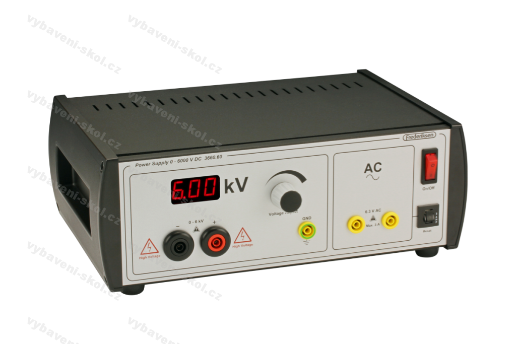 Stabilizované a plynule nastavitelné napětí 0-6 kV DC. Proudové omezení vestavěnou sérií odporů. Zkratový proud max. 2 mA. Výstup AC 6,3 V, 3 A.