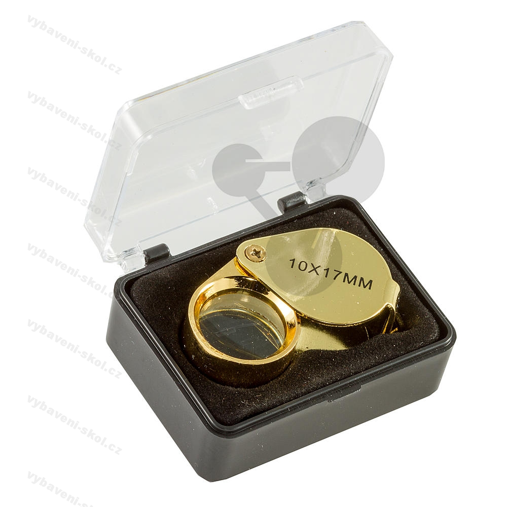 Zvětšení 10x. Aplanatická a achromatická skládací lupa se skleněnou čočkou. Průměr 17 mm. S pouzdrem.
