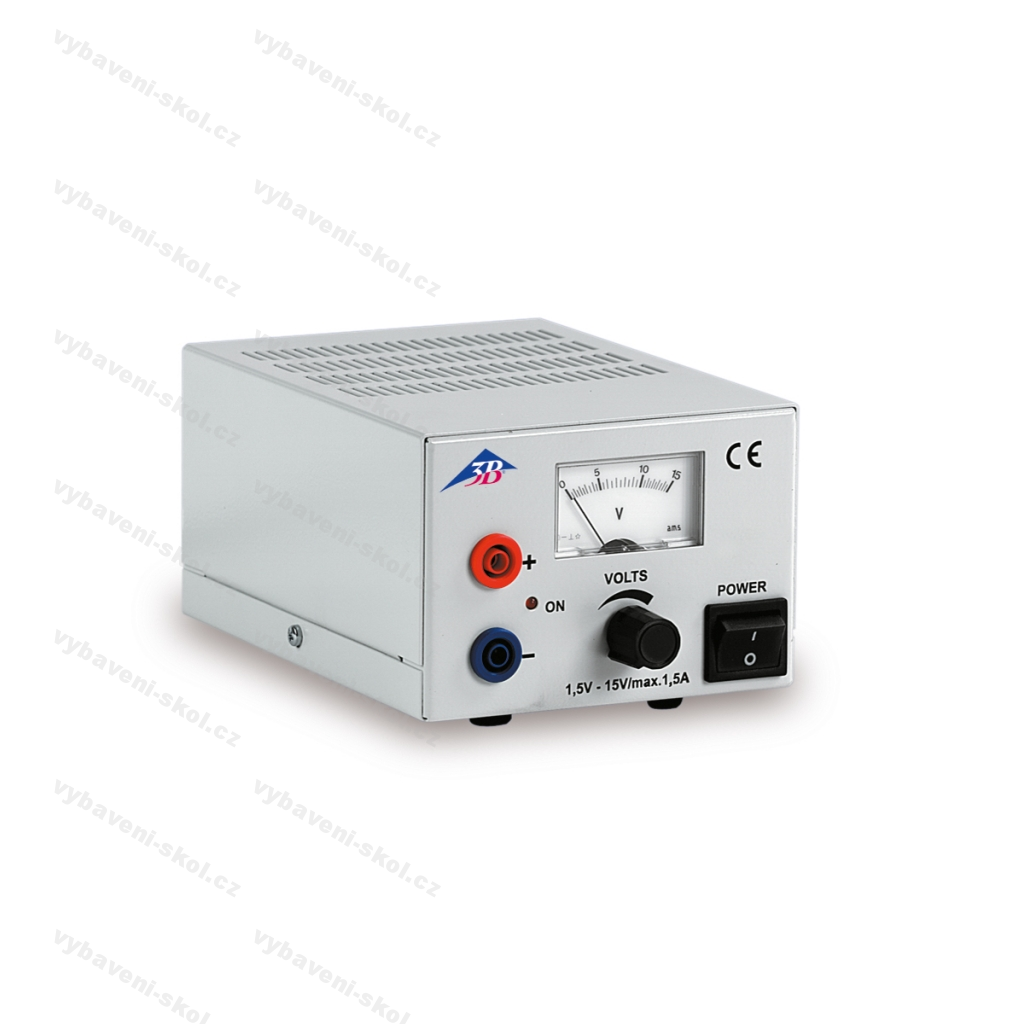 Jednoduchý zdroj s plynulou regulací výstupního napětí. DC výstup 1,5 - 15 V, max. 1,5 A. Zbytkové zvlnění 10 mV. Analogový voltmetr. Jištění proti zkratu.