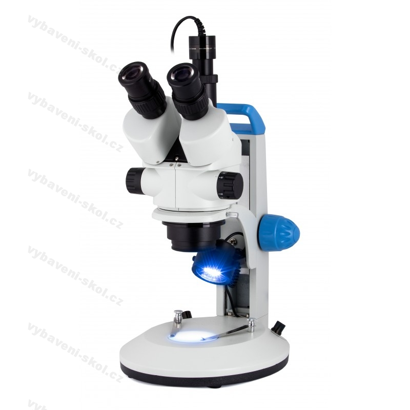 Trinokulární stereoskopický mikroskopický komplet. Optický systém Greenough, rozsah plynulého ZOOMu 0,7x – 4,5x, pracovní vzdálenost 100 mm. Stativ s pevným ramenem s intenzivním LED osvětlením s plynulou regulací intenzity jasu. Mikroskop je osazen USB kamerou s rozlišením až 1,3 Mpix a je dodáván včetně zobrazovacího SW s možnostmi měření (CZ lokalizace), ukládání obrázků i videa, vkládání popisků a grafických prvků do obrázku atd.