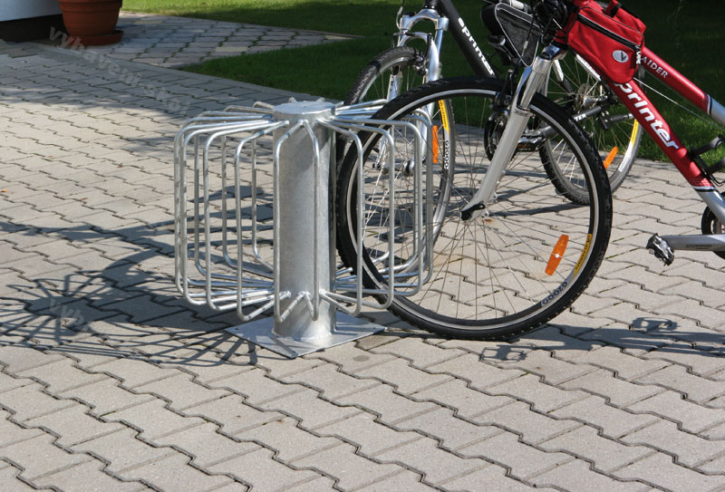 Vícemístný stojan na kola, postavení do prostoru, ocelové profily. 60 x 64 cm (V x průměr).