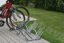 Cyklostojan pro 5 kol s nízkými a vysokými nosnými částmi. Vytváření řad. 130,4 x 60 x 40cm (D x Š x V).