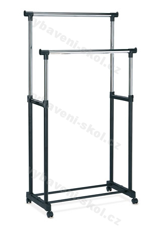 Stojan na šaty na kolečkách v provedení černá/chrom s 2 odkládacími rameny. Rozměry: 85x45x95-170 cm (ŠxHxV).