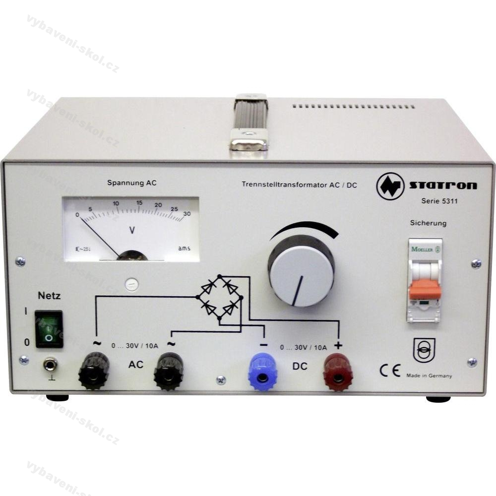 Stolní laboratorní zdroj AC/DC. Výstupní napětí 0-30 V, výstupní proud 10 A. Plynulá regulace, analogový ukazatel napětí.