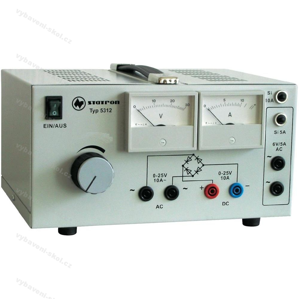 Stolní laboratorní zdroj AC/DC. Výstupní napětí 0 - 25 V. Výstupní proud max 10 A + pevné napětí 6 V / 5 A AC. Plynulá regulace. Analogové ukazatele napětí a proudu.