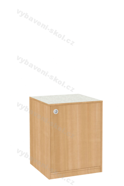 Základní nábytkové a pracovního vybavení odborné vzdělávací učebny fyziky, chemie. Nízká skříňka slouží pro ukládání relevantních pracovních pomůcek, může se stát součástí učitelského nebo studentského pracoviště. Je zhotovená z laminované dřevotřískové desky LTD o síle 18 mm (k výběru barevné varianty). Vrchní deska je vyrobená z odolné umakartové desky (typ a barva v nabídce níže). Nejvíce namáhané hrany jsou opatřené ochranným systémem ABS v tloušťce 2 mm. Spodní část panelové skříně tvoří úložný policový systém krytý dvířky s možností volby barvy. Dveře jsou opatřené kovovými kruhovými úchyty (v nabídce další druhy), je možné je vybavit zámkem. Vnitřní stavitelné police s nosností 30 kg. Skříň je umístěná na 5 cm vysokém soklu.