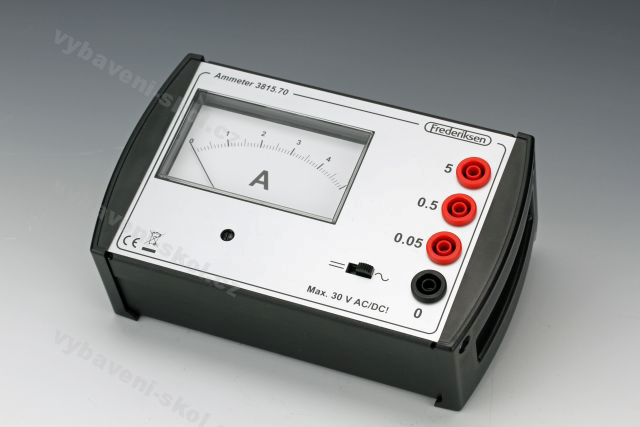 Robustní školní analogový ampérmetr s jednoduchou obsluhou. Rozsahy 0 - 0,05 A, 0 - 0,5 A a 0 - 5 A (AC, DC).