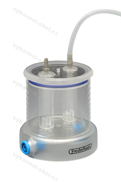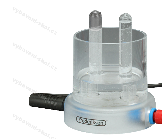 Jednoduchý elektrolyzér s platinovými elektrodami. Vstup stejnosměrného proudu je zajištěn 4 mm zdířkami. Plyn je jímán do dvou miniaturních zkumavek. Vyrobeno z kyselinovzdorného plastu.