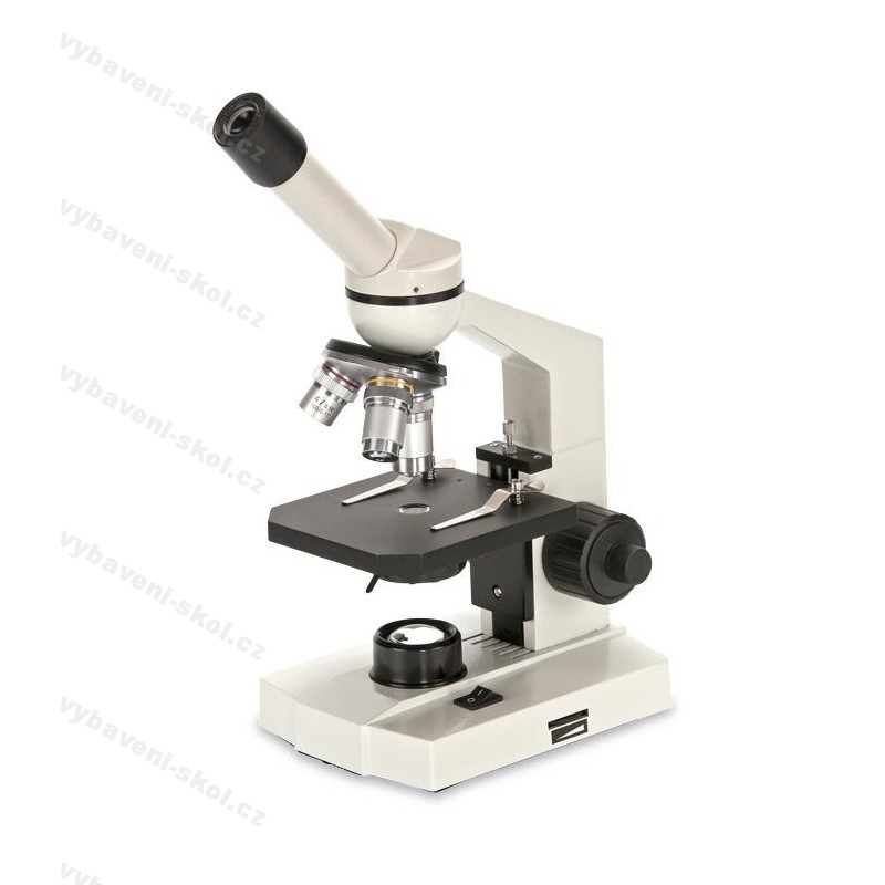 Monokulární studentský mikroskop. Achromatické objektivy, zvětšení až 400x. LED osvětlení s regulací jasu.