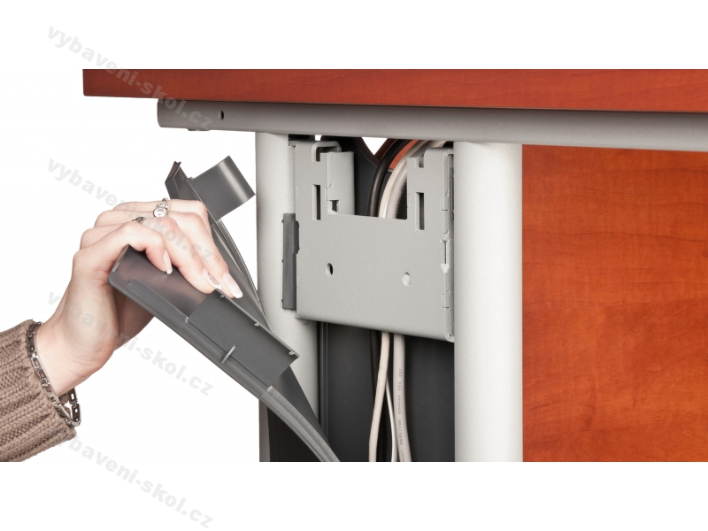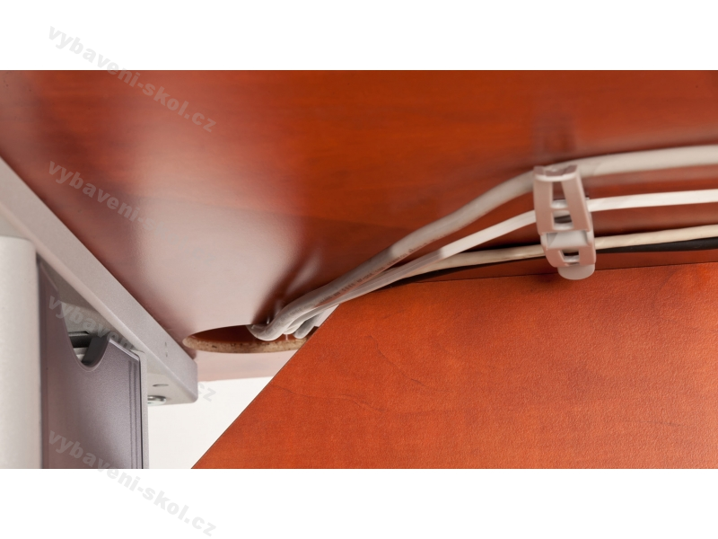 Ergonomicky tvarovaná pracovní deska stolu Cross CE 2005 L vykrojená do oblouku zajišťuje maximální využití pracovní plochy. Pracovní deska je síly 25 mm, vyrobena z laminované dřevotřísky a je opatřena ochrannou hranou ABS o síle 2 mm, která stůl chrání před případným poškozením. Na pracovní ploše je umístěna praktická průchodka, která je určena pro svod kabelů pod pracovní desku, kde lze kabely uchytit chytře zkonstruovanými plastovými držáky. Kabely lze dále vést kovovou nohou s plastovým krytem, který kabely schová. Designové provedení kovové nohy a odstín lze vybrat z nabídky níže. Plastový kryt je v barvě antracitu. Nohy stolu jsou spojeny 18 mm silnou laminovou dřevotřískovou deskou, která zajišťuje pevnost stolu. Nohy jsou opatřeny výškově stavitelnou rektifikací, která umožňuje dorovnání podlah až o 15 mm. Stůl lze kombinovat s jinými nábytkovými prvky díky jednoduchému spojovacímu systému, který je automaticky součástí každého prvku společně s přehledným návodem. Barevné provedení dřeva lze vybrat z níže uvedeného vzorníku.