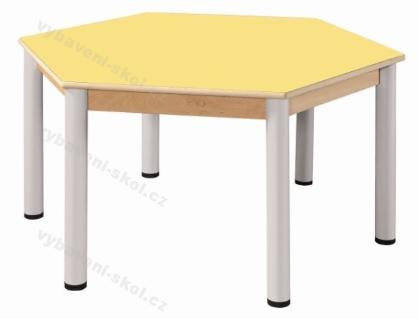 Stůl šestiúhelníkový, výškově stavitelné nohy. Rozměr: 120x120x52 - 70 cm (ŠxHxV).