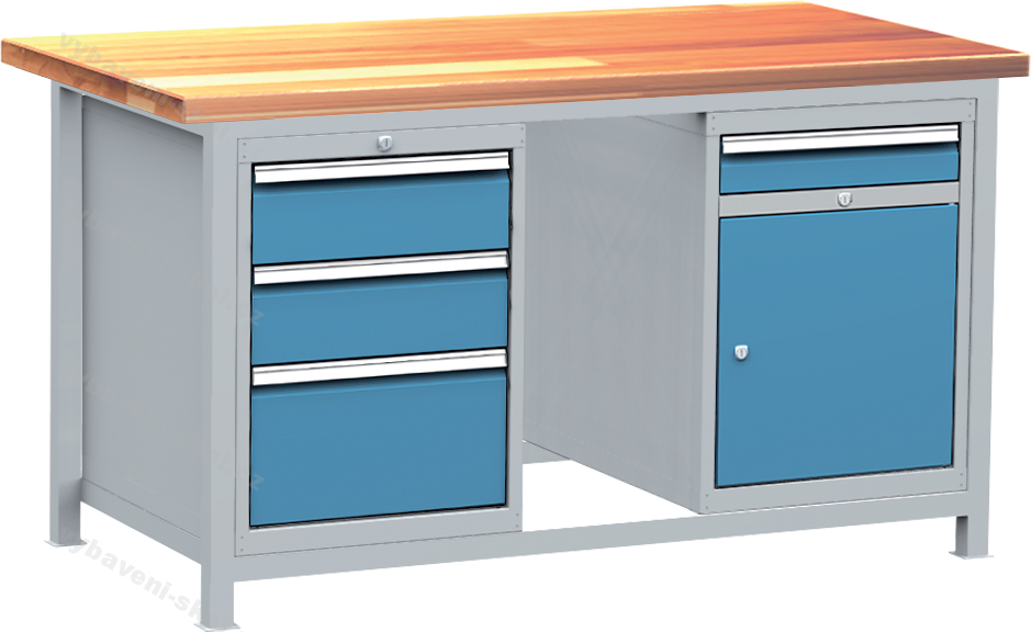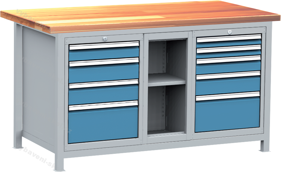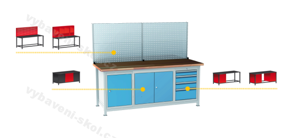 Profesionální svařované pracovní stoly s masivní konstrukcí jsou vhodné do provozů s vysokými požadavky na odolnost a zátěž. Pracovní deska stolu z bukové voděvzdorně lepené spárovky o tloušťce 40 mm snese zátěž až 1000 kg. Výška noh je 810 mm, celková výška pracovní plochy je 850 mm. Pracovní stoly je možno vybavit panely k uchycení držáků nástrojů a nářadí (tzv. Q-systém) nebo podvěsnými policovými, zásuvkovými, kombinovanými kontejnery. Na spodní výztuhu noh lze připevnit odkládací polici opět z bukové spárovky.( V případě jiného dovybavení stolu nás kontaktujte bude Vám navržena kalkulace dle vašich požadavků).