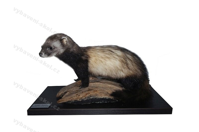 Reálný dermoplastický preparát tchoře tmavého v reálné pozici.