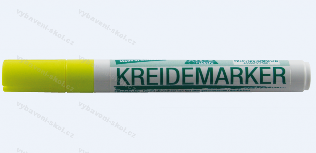 Popisovače s náplní tekuté křídy. Sada 4 kusů - barva neonová žlutá. Bezprašné a snadno stíratelné. Kulatý hrot 2 - 5 mm. Zdravotně nezávadné, vhodné i pro alergiky a astmatiky. Určeno k popisování všech hladkých neporézních povrchů, např. zelené, modré, černé i bílé keramické a emailové tabule, interaktivní tabule, plastové, fóliované, porcelánové, keramické, zrcadlové nebo skleněné povrchy. Možnost použití v kružítkách typu Precizion, Dynamic nebo Magnat. Zdravotní nezávadnost podle norem CE a EN 71-3. 100% ekologický výrobek.