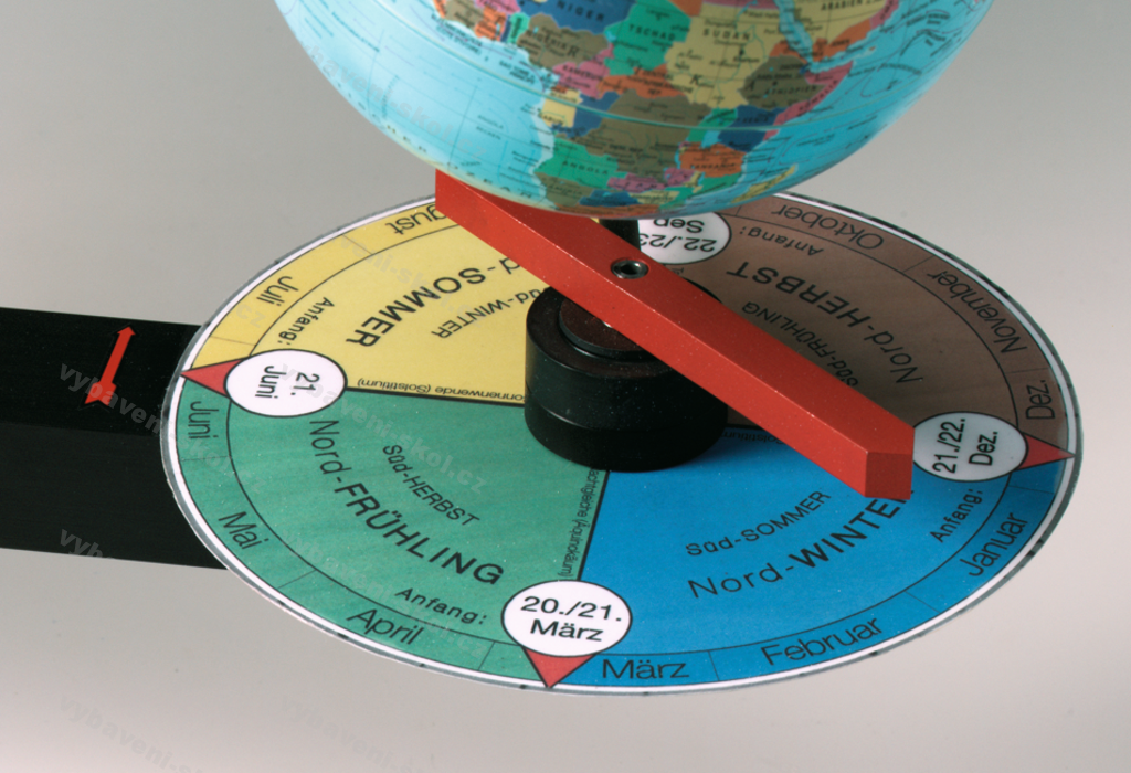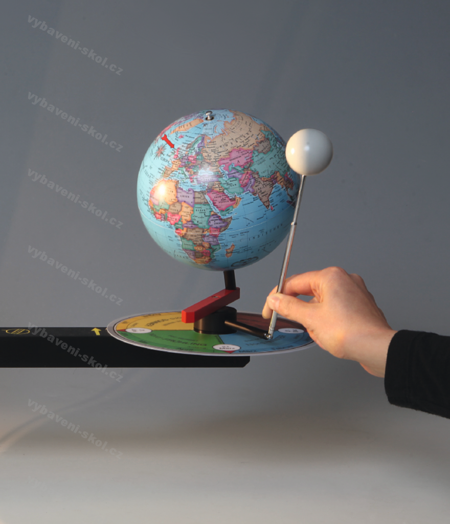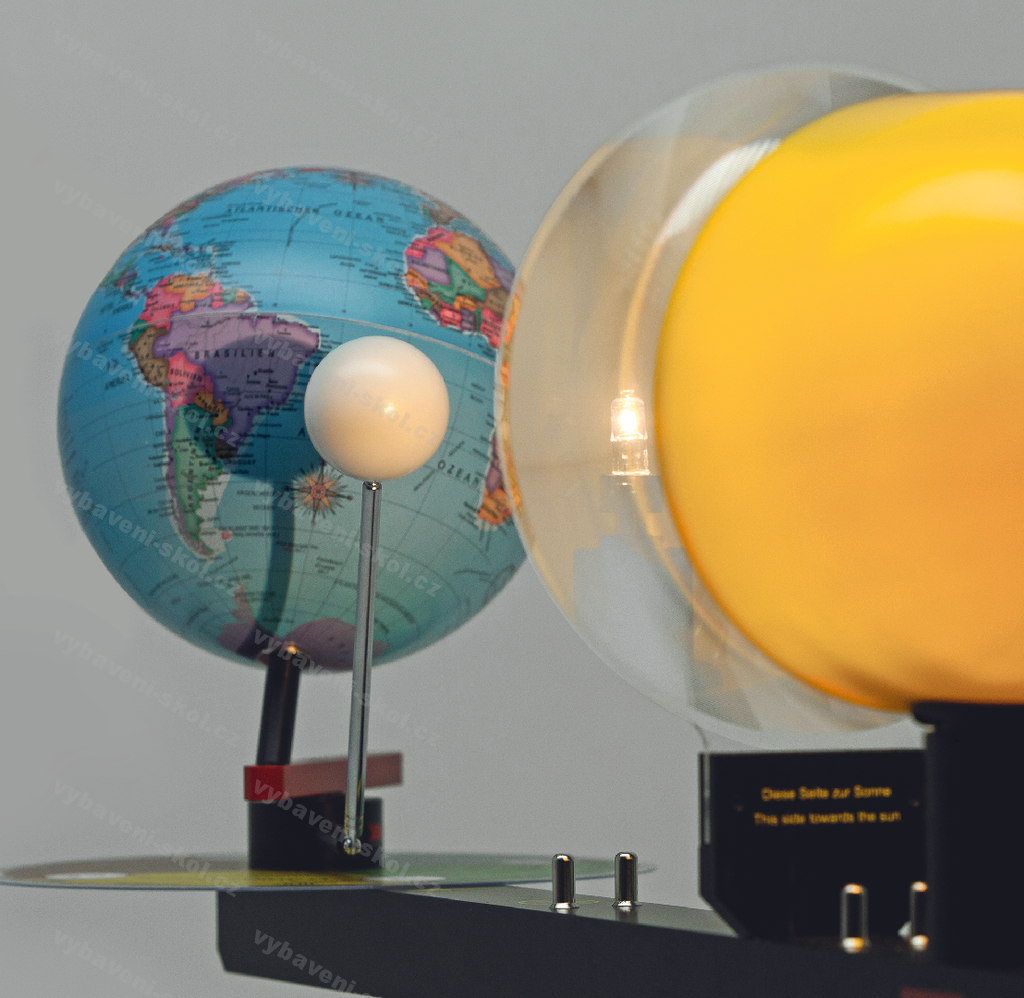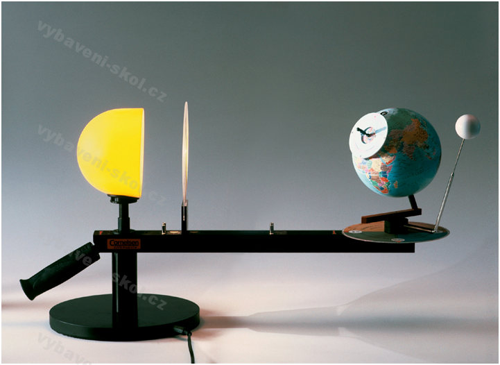 Model Slunce, Země a Měsíce. Slunce znázorněno halogenovým světelným zdrojem. Možné pozorovat den a noc, zatmění, příliv a odliv, polární den a noc, měnící se délka stínu během dne a ročních období aj.
