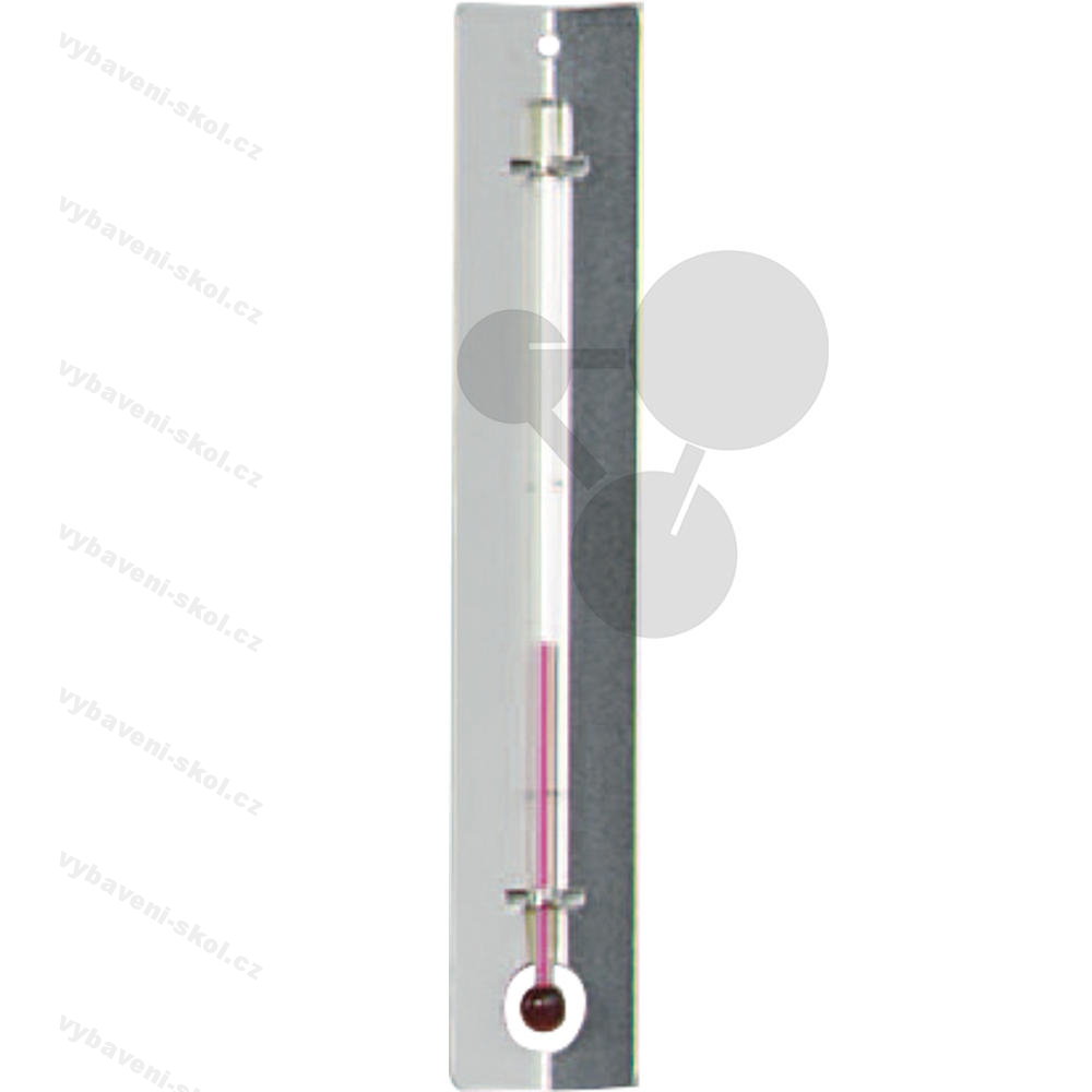 0 °C až +100 °C bez dělení stupnice. Žákovský teploměr se zahnutou kovovou škálou.
