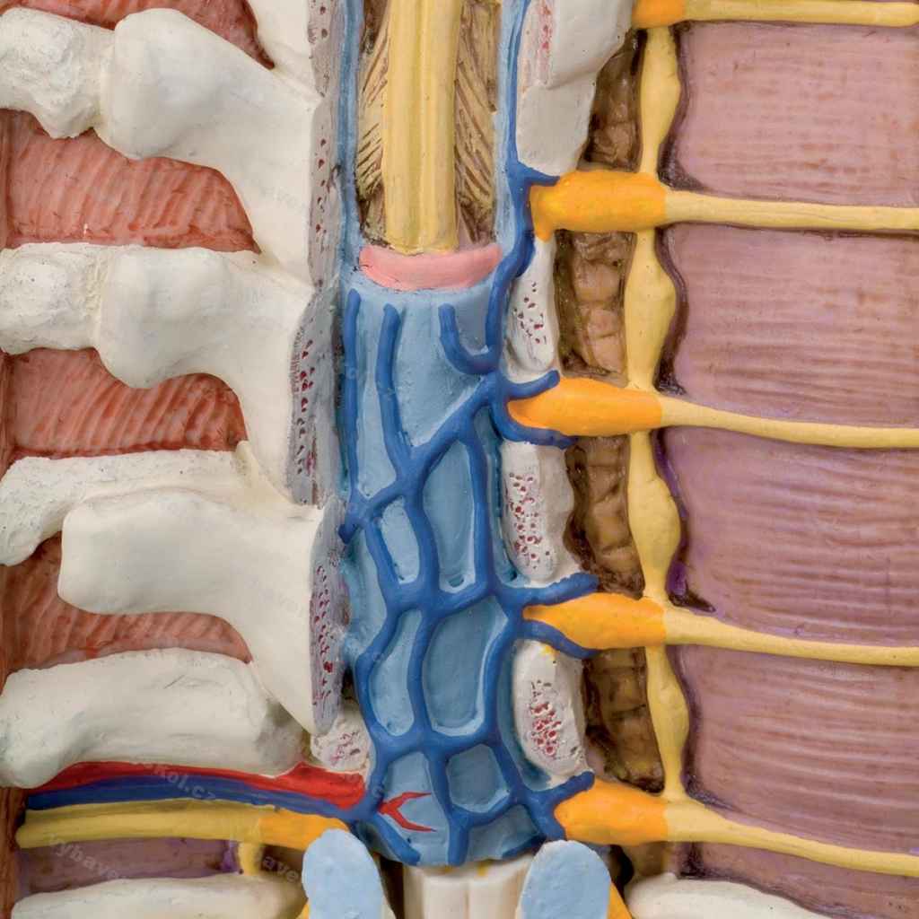 Bezpohlavní torzo rozložitelné na 18 dílů. Otevřená záda, viditelné ploténky, obratle, mícha, spinální nervy, vertebrální artérie. Vyjímatelný hrudní obratel. Kvalita 3B Scientific.