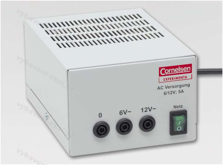 Výrobce Cornelsen Experimenta. Kovový obal s větracími otvory. Vypínač. Výstupní napětí nestabilizováno. Teplotní ochrana, ochrana proti zkratu. Výstupy galvanicky oddělené od sítě. Certifikace CE. Výstupy 6 V a 12 V. Zatížení až 5 A. Rozměry 14 x 13 x 21 cm, hmotnost 2,6 kg.