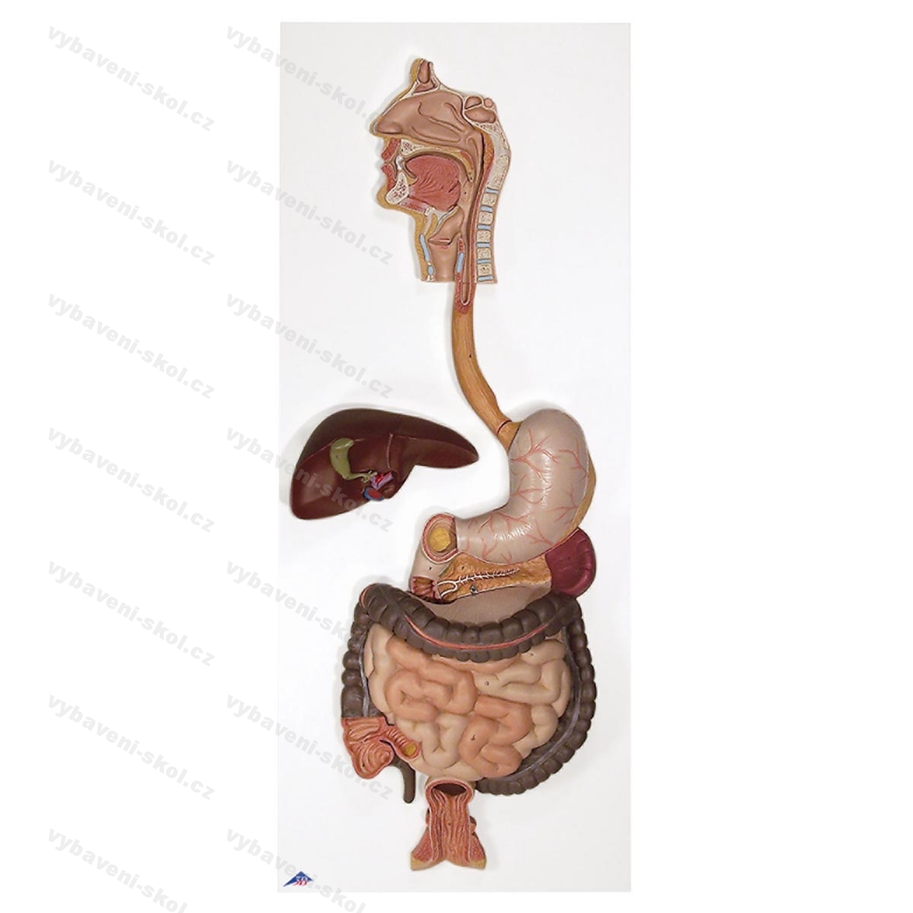 Reliéfní plastový model v životní velikosti. Nos, ústní dutina, hltan, jícen, žaludek, střevní trakt, játra, ..., konečník. Příčný tračník a přední polovina žaludku vyjímatelná. Kvalita 3B Scientific.