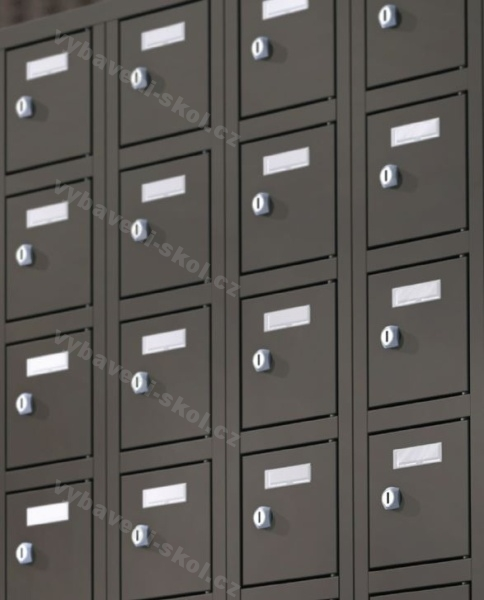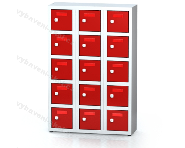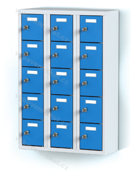 Skříňka (minibox) třídílná s patnácti uzamykatelnými schránkami na soklu 25 mm. Rozměr: 91,1x60x20 cm (VxHxŠ), výška oddělení 15,2 cm.