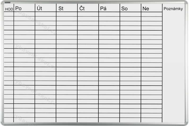 Velmi populární a inteligentní vybavení všech pracovních prostorů. Týdenní plánovací tabule zajišťuje efektivní plánování času a slouží k přehledné, rychlé a snadné orientaci v činnosti. Povrch tabule je dvouvrstvý keramický, smalt nanášený na kov při teplotě 810°C. Povrch je vysoce odolný, určený ke každodennímu využívání. Tabule je potištěná mřížkou ve stříbrné barvě, která tabuli dělí na dny v týdnu, jednotlivé hodiny a nezbytný prostor na poznámky. Popisovatelná pole jsou dostatečně velká pro různé informace. Tabule je určená pro popis fixem stíratelným za sucha, použití magnetických pásků, magnetů. Tabule je zasazená v kvalitním, lehkém rámu z eloxovaného hliníku se zaoblenými plastovými koncovkami. V příslušenství tabule je praktická odkládací lišta a montážní sada pro zavěšení tabule na stěnu. Tabuli je možné zavěsit na lištový systém nebo umístit na trojnožku. Po dohodě lze vyrobit tabuli dle požadavků. Rozměry 70x100 cm (V x Š).