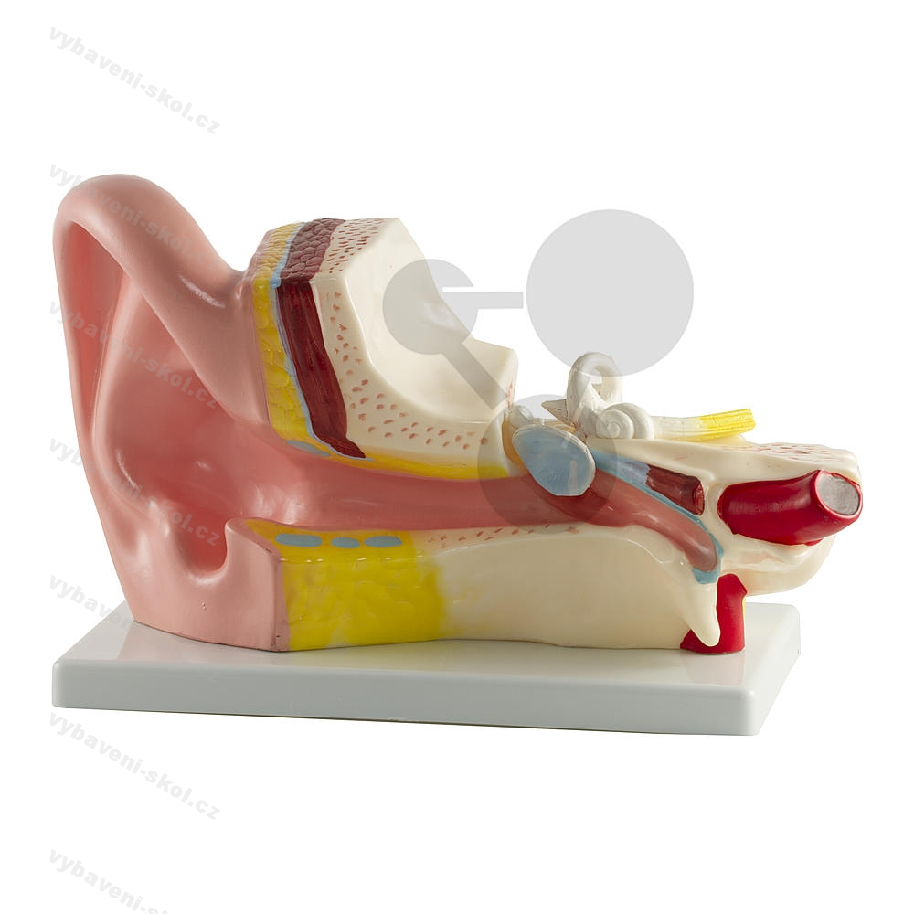 V kvalitě LabGear. Model představuje zevní, střední a vnitřní ucho a bubínek s kladívkem, kovadlinku a labyrint s hlemýžděm. Hlemýžď, sluchový a rovnovážný nerv lze vyjmout. 25 x 17 x 10 cm. Pro 2. stupeň ZŠ.