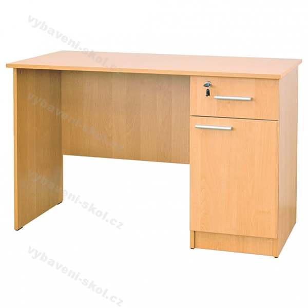 Součástí každé vzdělávací učebny je kvalitní učitelský stůl pro zajištění vlastního zázemí vyučujícího. Učitelská katedra Alfred je vyrobená z odolných oboustranně laminovaných dřevotřískových desek, které na nejvíce namáhaných částech chrání hrany ABS. Stůl v provedení přírodní buk. Pravou část stolu doplňuje úložný prostor krytý dvířky a vybavený v horní části zásuvkou. Zásuvku lze dovybavit také zámkem. Přední část stolu kryje široká deska trnož. Rozměry 160x76x60cm (ŠxVxH).