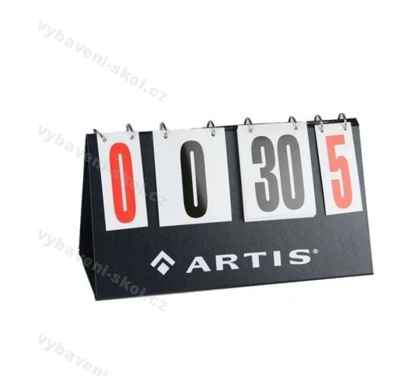 Skládací počítadlo skóre, červená čísla = 0 - 5, černá čísla = 0 - 30. Vhodné pro: volejbal, stolní tenis, hokej, fotbal, apod. Rozměry: 46 x 26 cm, když se postaví šířka základny 19,5 cm.