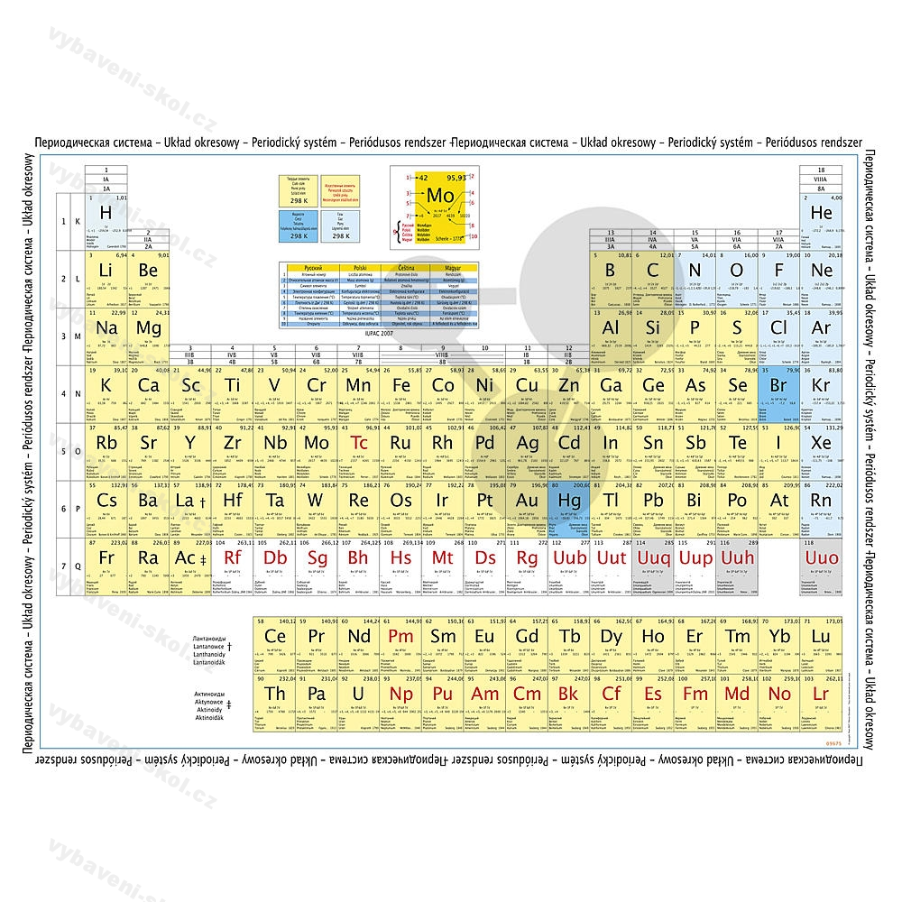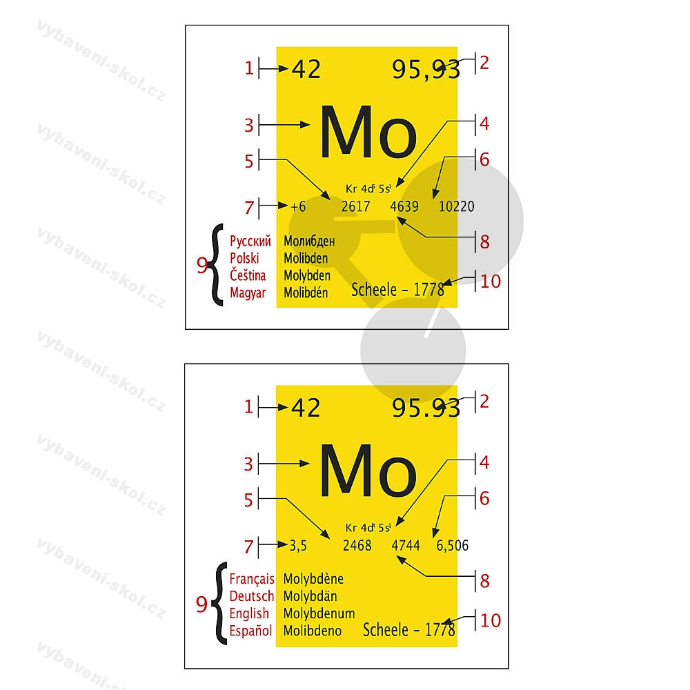 U každého prvku jsou uvedeny následující údaje: chemický symbol, pořadové číslo, bod tání, bod varu, oxidační číslo, objemová hmotnost, atomová hmotnost, konfigurace elektronů, jméno objevitele a rok objevení, název prvku ve 4 jazycích.