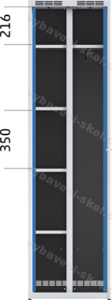 Skříň šatní s jednoplášťovými dveřmi, šíře odd. 700 mm, počet odd.: 1, v oddělení 270 mm od víka police, tyč se třemi plastovými háčky, v druhé polovině skříně čtyři police. Rozměr: 180x70x50 cm.