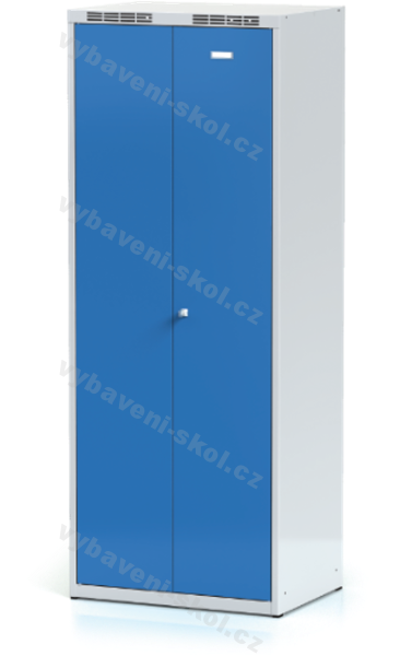 Velkoobjemové šatní skříně jsou konstruovány tak, aby měl jeden uživatel k dispozici dva oddělené úložné prostory. Dvě křídla dveří jsou společně uzamykatelná jedním zámkem. Vyrábíme skříně se šířkou oddělení 500, 600, 750 a 800 mm. V nabídce jsou tři základní produktové linie, které se liší konstrukcí dveří a rozsahem standardní výbavy. Díly korpusu jsou v přední části speciálně profilované a jednotlivé konstrukční prvky jsou vzájemně spojené tak, aby bylo dosaženo vysoké pevnosti a nadstandardní odolnosti. Šatní skříně s vloženými dveřmi se vyznačují univerzální využitelností, odolnou svařovanou konstrukcí, moderním vzhledem a pečlivým zpracováním. Kovové díly jsou vyrobeny z ocelového plechu se zvýšenou pevností. Ocelový korpus je vybaven účinným systémem přirozeného odvětrávání a je osazen plastovými kluzáky (možnost výškově stavitelných kluzáků). Uvnitř každého oddělení je v horní části umístěna police s plošnou nosností 30 kg, pod policí je uchycená šatní tyč s plastovými háčky. Rámová konstrukce přední části korpusu je nově profilovaná. Poskytuje tak vyšší odolnost proti násilnému vtlačení dveří do korpusu a zároveň tvoří tuhou oporu bezpečnostní závory zámku. Dveře jsou jednoplášťové, výztužné profilem přes celou výšku dveří, zesílení konstrukce v oblasti zámku – ochrana proti protočení a vyhnutí závory. Dveře jsou zavěšené na masivních kovových čepech, maximální úhel otevření dveří 100° a jsou vybaveny cylindrickým, otočným bezpečnostním uzávěrem nebo otočným uzávěrem bez příplatku, další zámky (mincovní, kódové nebo elektronické) jsou za příplatek. Standardní výbava skříňky háček na ručník v konstrukci dveří, odkládací police s nosností 30 kg, šatní tyč s nosností 10 kg, v každém oddělení dva plastové háčky s nosností 4 kg, každá skříň je vybavena montážními otvory pro spojení do řad a pro montáž ke konstrukci předlavičky. Povrchová úprava ocelového ve standardním provedení je ocelový plech s úpravou fosfátu a práškové vypalovací barvy v odstínu Ral 7035 (šedá matná) konstrukce. Na dotaz nadstandardní vybavení s možností jejich doplnění do skříně (povrchová úprava zinkem, šikmá stříška, výška soklu, zámky, atd.).