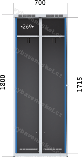 Velkoobjemové šatní skříně jsou konstruovány tak, aby měl jeden uživatel k dispozici dva oddělené úložné prostory. Dvě křídla dveří jsou společně uzamykatelná jedním zámkem. Vyrábíme skříně se šířkou oddělení 500, 600, 750 a 800 mm. V nabídce jsou tři základní produktové linie, které se liší konstrukcí dveří a rozsahem standardní výbavy. Díly korpusu jsou v přední části speciálně profilované a jednotlivé konstrukční prvky jsou vzájemně spojené tak, aby bylo dosaženo vysoké pevnosti a nadstandardní odolnosti. Šatní skříně s vloženými dveřmi se vyznačují univerzální využitelností, odolnou svařovanou konstrukcí, moderním vzhledem a pečlivým zpracováním. Kovové díly jsou vyrobeny z ocelového plechu se zvýšenou pevností. Ocelový korpus je vybaven účinným systémem přirozeného odvětrávání a je osazen plastovými kluzáky (možnost výškově stavitelných kluzáků). Uvnitř každého oddělení je v horní části umístěna police s plošnou nosností 30 kg, pod policí je uchycená šatní tyč s plastovými háčky. Rámová konstrukce přední části korpusu je nově profilovaná. Poskytuje tak vyšší odolnost proti násilnému vtlačení dveří do korpusu a zároveň tvoří tuhou oporu bezpečnostní závory zámku. Dveře jsou jednoplášťové, výztužné profilem přes celou výšku dveří, zesílení konstrukce v oblasti zámku – ochrana proti protočení a vyhnutí závory. Dveře jsou zavěšené na masivních kovových čepech, maximální úhel otevření dveří 100° a jsou vybaveny cylindrickým, otočným bezpečnostním uzávěrem nebo otočným uzávěrem bez příplatku, další zámky (mincovní, kódové nebo elektronické) jsou za příplatek. Standardní výbava skříňky háček na ručník v konstrukci dveří, odkládací police s nosností 30 kg, šatní tyč s nosností 10 kg, v každém oddělení dva plastové háčky s nosností 4 kg, každá skříň je vybavena montážními otvory pro spojení do řad a pro montáž ke konstrukci předlavičky. Povrchová úprava korpusu ve standardním provedení je ocelový plech s úpravou fosfátu a práškové vypalovací barvy v odstínu Ral 7035 (šedá matná) konstrukce. Na dotaz nadstandardní vybavení s možností jejich doplnění do skříně (povrchová úprava zinkem, šikmá stříška, výška soklu, zámky, atd.).