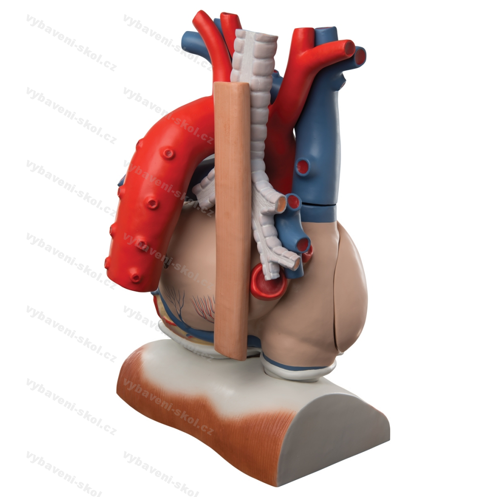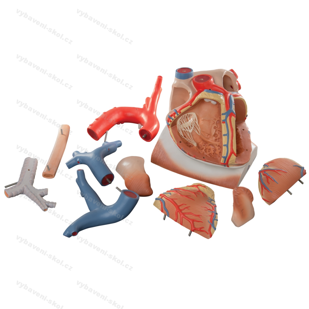 Rozložitelný model lidského srdce. Trojnásobná velikost. Vyjímatelné jícen, průdušnice, horní dutá žíla, aorta, plicní tepny, obě stěny předsíně i srdeční komory. Ruční zpracování. Kvalita 3B Scientific.
