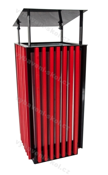Nejprodávanější venkovní dřevěný odpadkový koš. Koš nabízí nepřeberné množství variant barvy konstrukce, latí či typu konstrukce. Základem venkovního odpadkového koše je ocelová konstrukce vykládaná dřevěnými latěmi. Smrkové dřevo je ošetřené lazurou s možností výběru barevného provedení s UV filtrem pro venkovní použití. Konstrukce je ošetřená vypalovanou barvou s možností výběru barevného provedení nebo žárově zinkována. Součástí koše jsou vyjímatelné pozinkované vložky. Manipulaci usnadňují vnitřní úchyty. Uplatnění nalezne jak v interiéru obchodních center, administrativních budovách, tak i ve venkovních prostorách. Koše je možno kotvit šrouby nebo přípravou k betonáži. Koš lze vybavit praktickou stříškou.