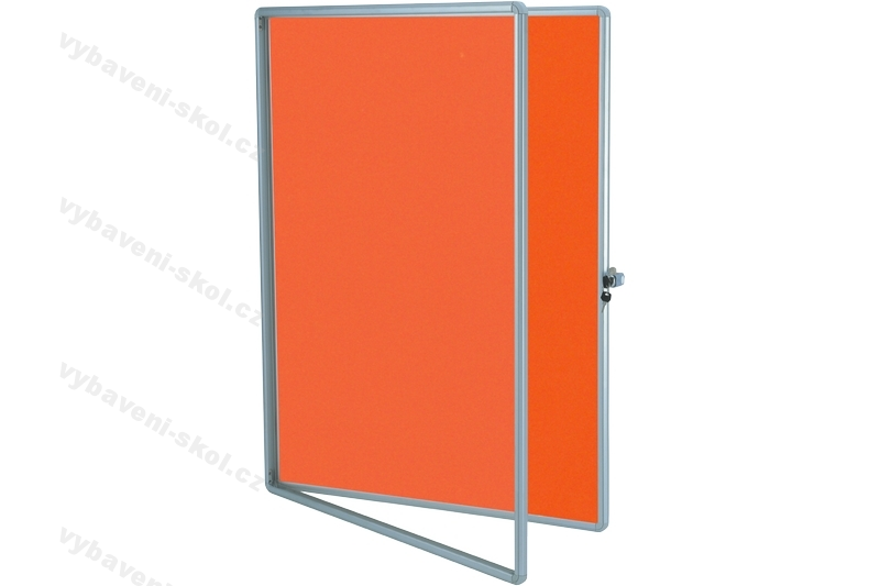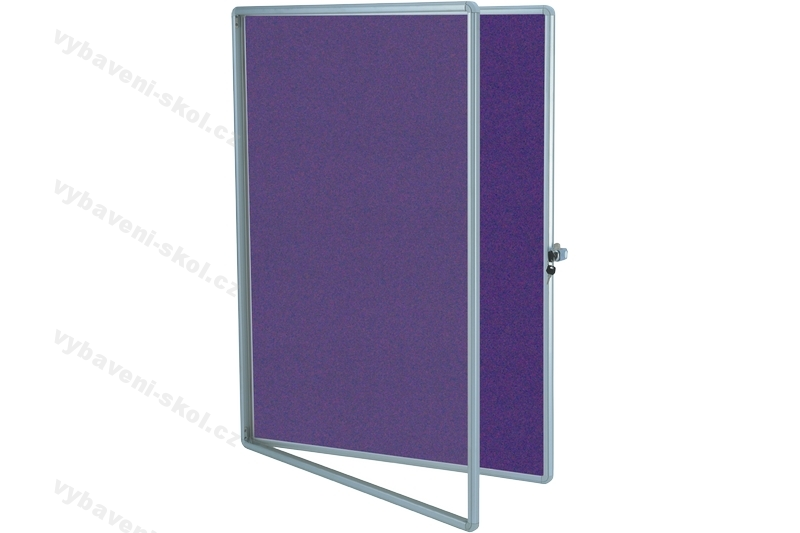 Kvalitní prosklená závěsná vitrína velmi dobře vyhovuje jako informační tabule, textilní nástěnka. Hloubka 19 mm. Povrch výplně je textilní (několik barevných variant), krátký vlas usnadňuje vpichování celé délky špendlíků. Sendvičová konstrukce zajišťuje nekroucení tabule. Látkovou vitrínu chrání jednokřídlové dveře s akrylátovým sklem, odolným vůči UV záření. Rámy vitríny jsou vyrobené z kvalitního eloxovaného hliníku se zaoblenými plastovými rohy. Dvířka vitríny jsou opatřené zámkem se 2 klíči. Vitrína je určená k použití ve vnitřních prostorách, lze ji zavěsit vertikálně i horizontálně. Montážní sada k uchycení na stěnu je součástí balení. Nástěnku lze umístit na paravánové nohy (nejsou součástí dodávky). Rozměry 150x100 cm (Š x V).