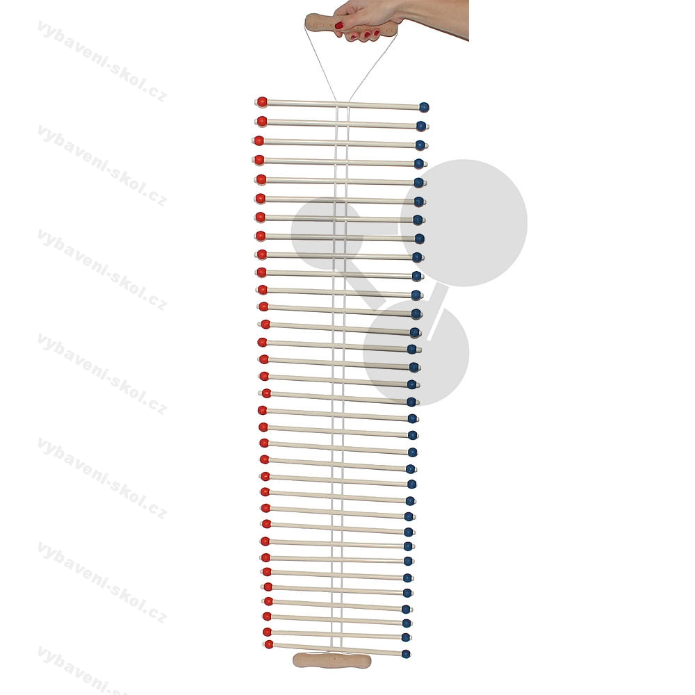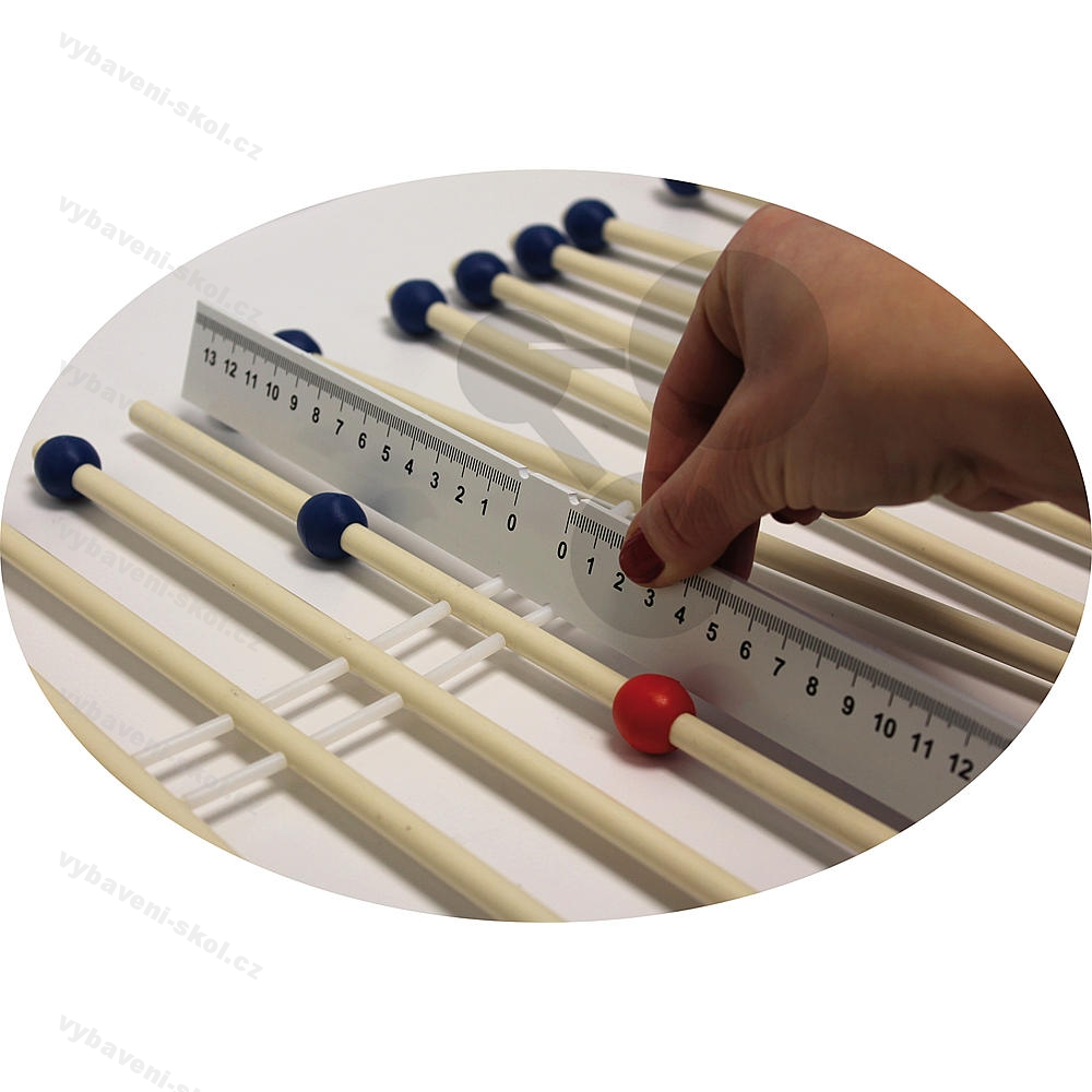 36 dvojitých kyvadel 300 x 8 mm (délka x průměr), 72 červených a modrých posuvných závaží, 70 plastových distančních držáků (délka = 25 mm), 1 pravítko, 2 dřevěné rukojeti spojené nylonovými nitěmi.