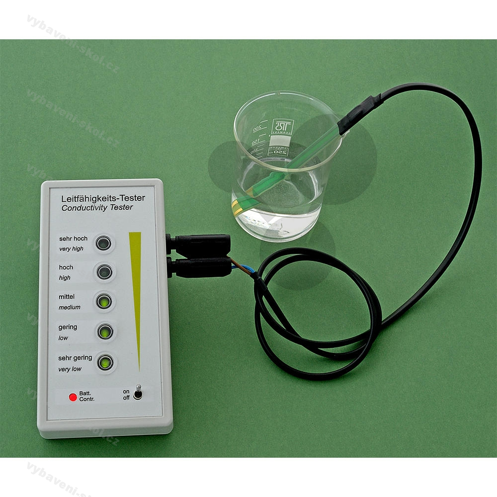 Speciálně pro použití s konduktometrem. Pro měření v solných roztocích a zředěných kyselinách a louzích. S pozlacenými měřicími elektrodami, 1,0 m dlouhý kabel a dva bezpečnostní konektory 4 mm.