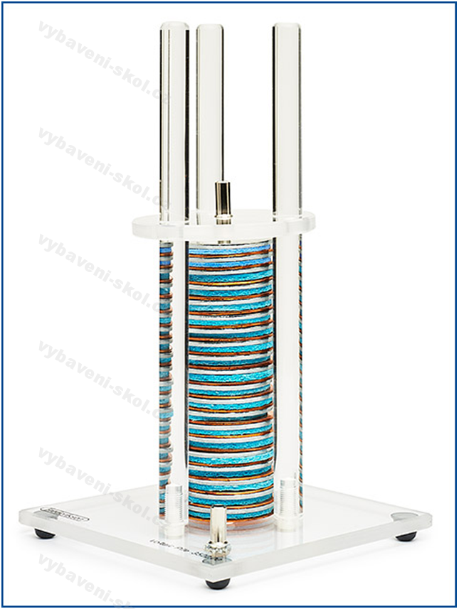 Model Voltova článku v téměř originální konstrukci, pouze původní dřevěné části nahrazeny moderním plastem. Baterie z galvanických článků. Článek tvořen zinkovým, porézním a měděným diskem.