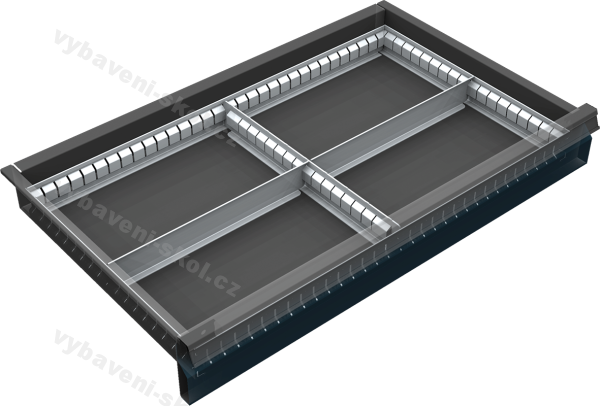 Praktický doplňkový sortiment do zásuvek, pozinkované vnitřní dělení 2x2 díly, nízké.