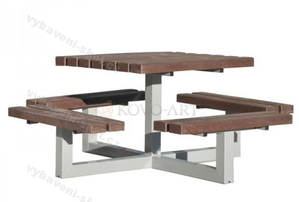 Tento model laviček a stolu čtvercového tvaru s plastovým recyklátem na stole a sedací ploše. Díky svému tvaru se skvěle hodí na zahrádky restaurací, rychlých občerstveních nebo i na odpočívadla při cyklostezkách. Ocelová kostra parkové soupravy z jeklového profilu 60x60 mm. Plastový recyklát hnědé barvy. Konstrukce je ošetřena vypalovanou barvou RAL z naší nabídky nebo žárovým zinkem. Soupravu je možno kotvit k zemi šrouby nebo zvolit variantu určenou k zabetonování.