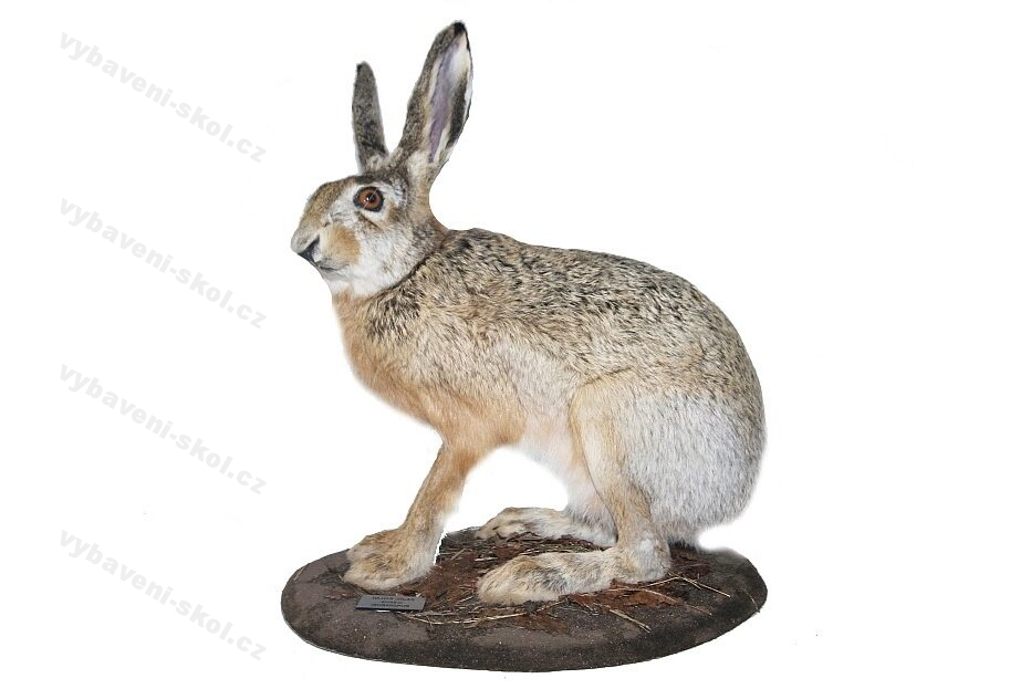 Reálný dermoplastický preparát zajíce polního v reálné pozici.