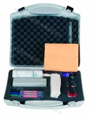 Základní příslušenství pro psaní a čištění bílé magnetické tabule. V sadě popisovače, hroty, inkoust, sprej, stěrka a náhradní vložky, magnety.