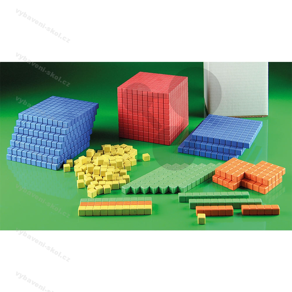 Barevná tělesa v kartonové krabici. 141 částí. Žluté jednoduché kostičky, zelené tyče, oranžové tyčky, modrá plata, červená kostka.