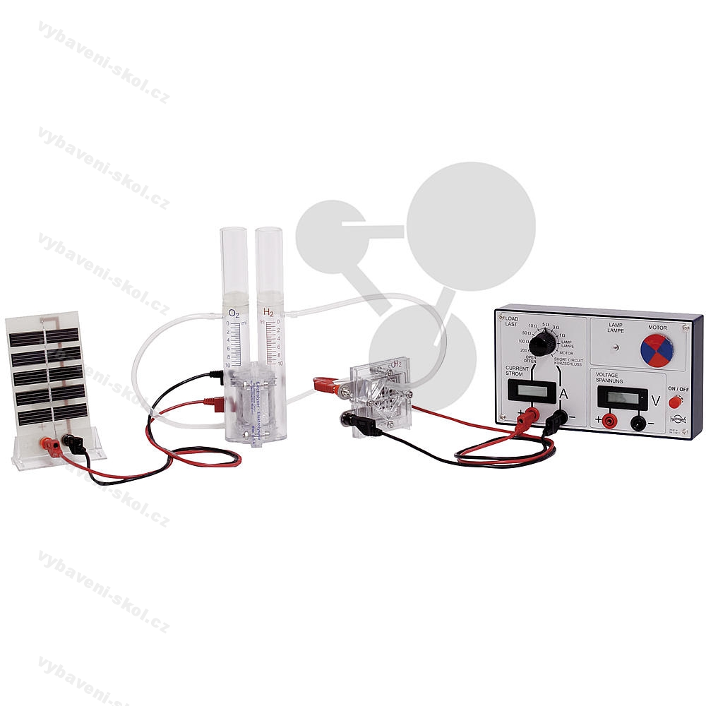 - PEM elektrolyzér (provoz s destilovanou vodou) s plynovým zásobníkem se stupnicí (1 W)